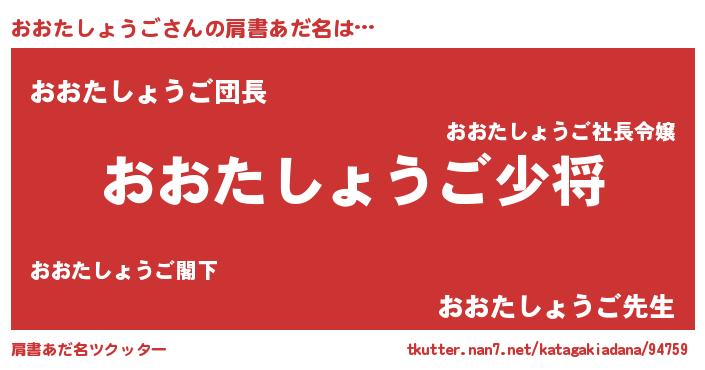 | 男性向けラノベタイトル風あだ名 | 『おおたしょうご~年齢イコール彼女いない歴の魔法使い~』 |