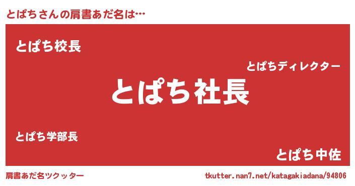 | 男性向けラノベタイトル風あだ名 | 『とぱちの憂鬱』『はたらくとぱちさま!』 |