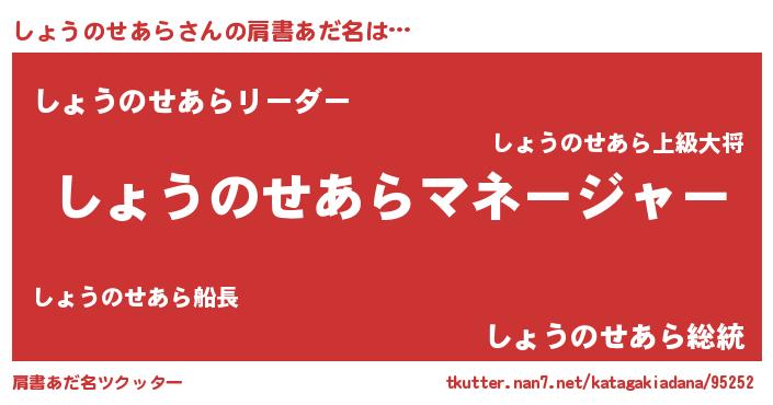 | 男性向けラノベタイトル風あだ名 | 『しょうのせあらに滅ぼされるだけの簡単なお仕事です』 |