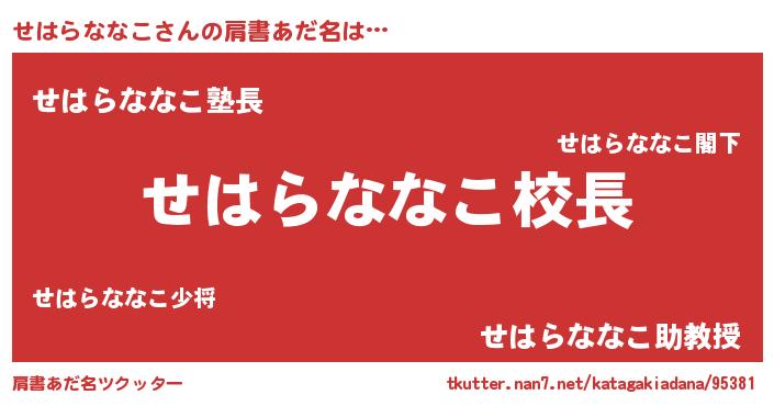 | 男性向けラノベタイトル風あだ名 | 『せはらななこという概念が存在しない退屈な世界 』 |