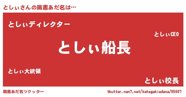 | 男性向けラノベタイトル風あだ名 | 『緋弾のトシィ』『はたらくとしぃさま!』 |