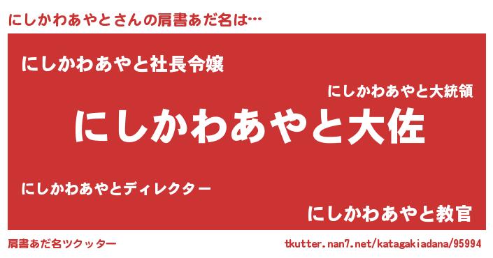 | 男性向けラノベタイトル風あだ名 | 『にしかわあやと~年齢イコール彼女いない歴の魔法使い~』 |