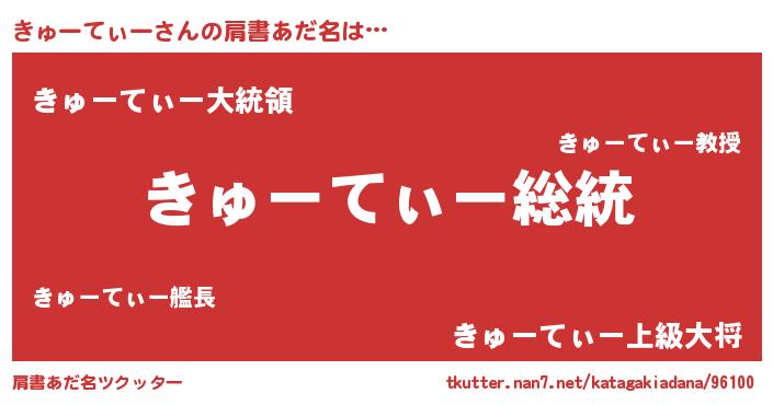 | 男性向けラノベタイトル風あだ名 | 『Re:きゅーてぃーから始める異世界生活』 |