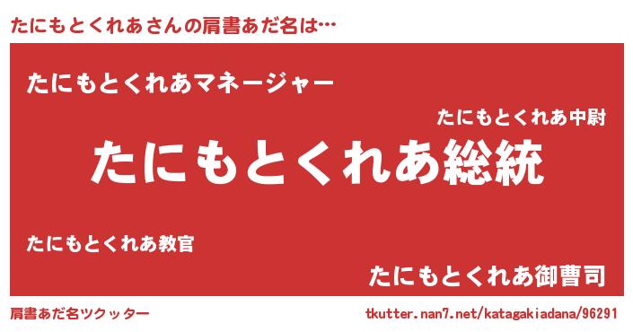 | 意味不明あだ名 | 『自称たにもとくれあ』 |