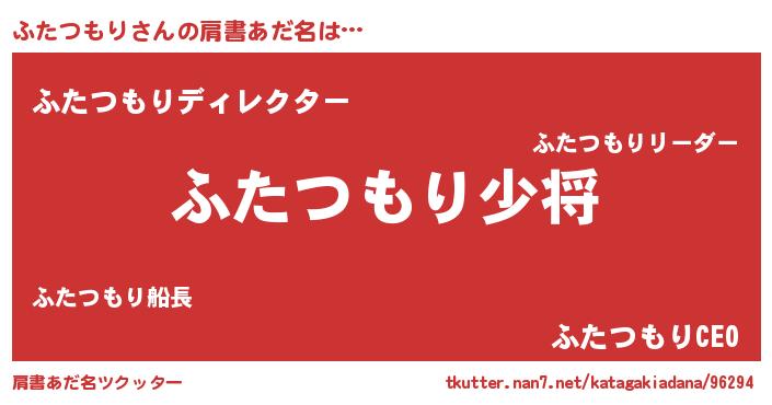 | 男性向けラノベタイトル風あだ名 | 『ふたつもり~年齢イコール彼女いない歴の魔法使い~』 |