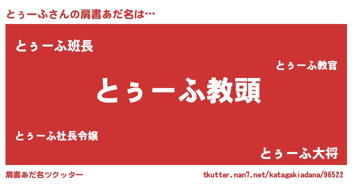 | 男性向けラノベタイトル風あだ名 | 『とぅーふという概念が存在しない退屈な世界 』 |