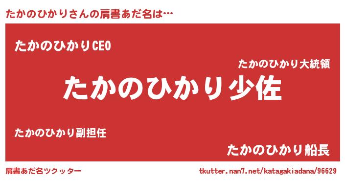 | 男性向けラノベタイトル風あだ名 | 『たかのひかり~年齢イコール彼女いない歴の魔法使い~』 |