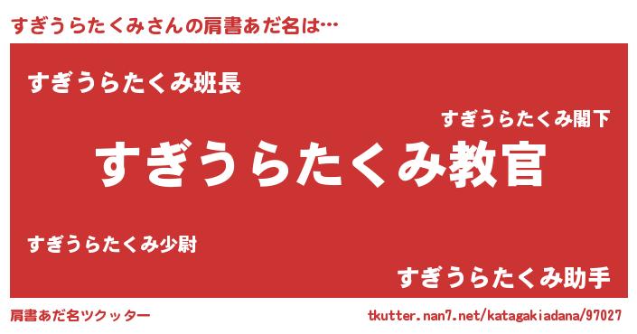 | 男性向けラノベタイトル風あだ名 | 『この素晴らしい世界にすぎうらたくみを!』 |