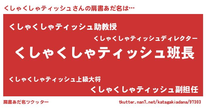 | 女子向けラノベタイトル風あだ名 | 『くしゃくしゃティッシュの卵を拾いまして』 |