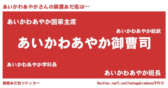 | 女子向けラノベタイトル風あだ名 | 『(仮)あいかわあやかのやんごとなき事情』 |
