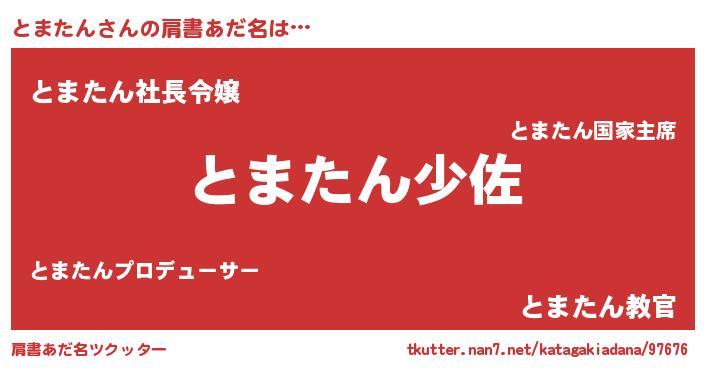 | 女子向けラノベタイトル風あだ名 | 『とまたんの玉の輿計画!』 |