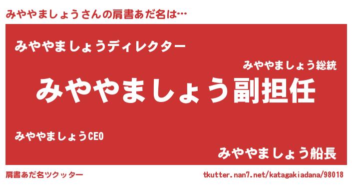| 胡散臭い通販商品みたいなあだ名 | 『絶対に幸福をもたらす水素水…その名も「みややましょう」』 |