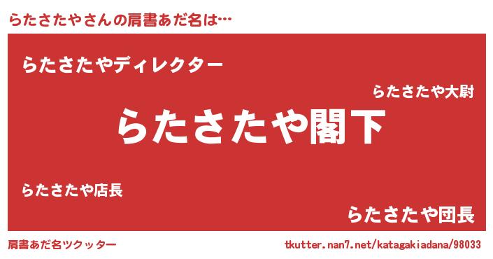 | 男性向けラノベタイトル風あだ名 | 『Re:らたさたやから始める異世界生活』 |