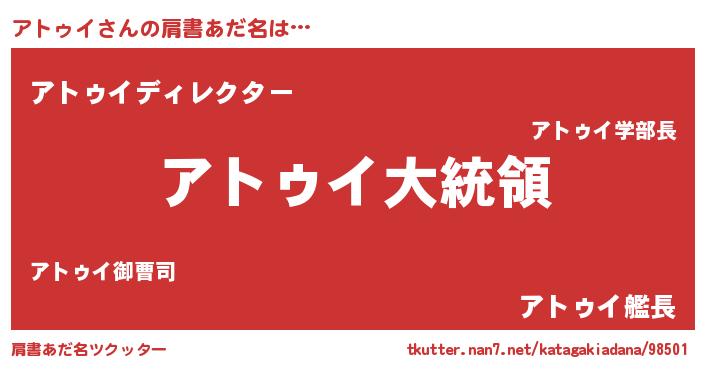 | 女子向けラノベタイトル風あだ名 | 『アトゥイの婚約者』『アトゥイ恋絵巻』 |
