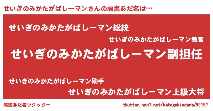 | 伝説のあだ名 | 『聞きしに勝る勇者せいぎのみかたがばしーマン』 |