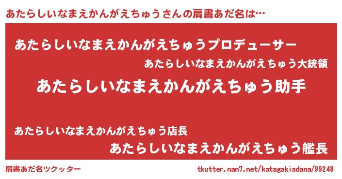 | 男性向けラノベタイトル風あだ名 | 『おまえをオタクにしてやるから、俺をあたらしいなまえかんがえちゅうにしてくれ! 』 |