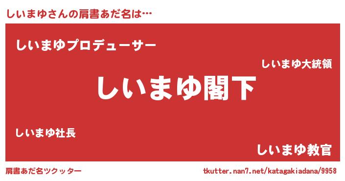 | 男性向けラノベタイトル風あだ名 | 『Re:しいまゆから始める異世界生活』 |