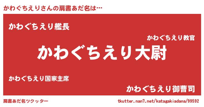 | 男性向けラノベタイトル風あだ名 | 『かわぐちえり~年齢イコール彼女いない歴の魔法使い~』 |