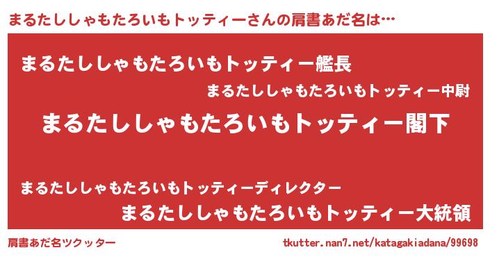 | 男性向けラノベタイトル風あだ名 | 『魔法科高校のまるたししゃもたろいもトッティー』 |