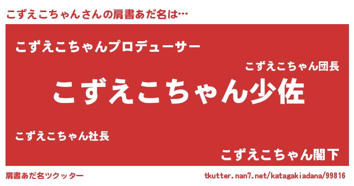 | 女子向けラノベタイトル風あだ名 | 『こずえこちゃんの玉の輿計画!』 |