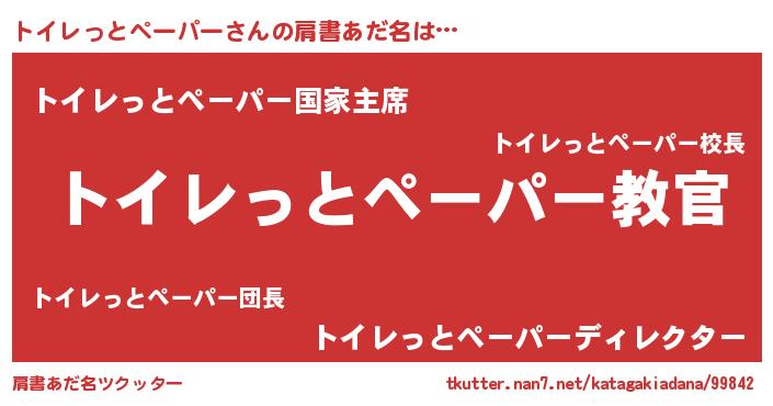 | 男性向けラノベタイトル風あだ名 | 『この素晴らしい世界にトイレっとペーパーを!』 |