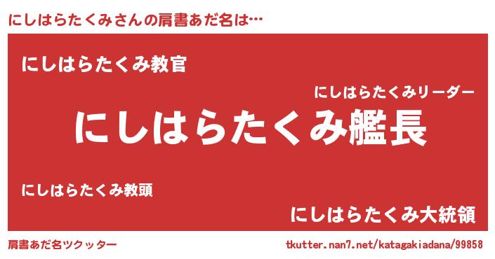 | 意味不明あだ名 | 『住所不定無職にしはらたくみ(40歳)』 |