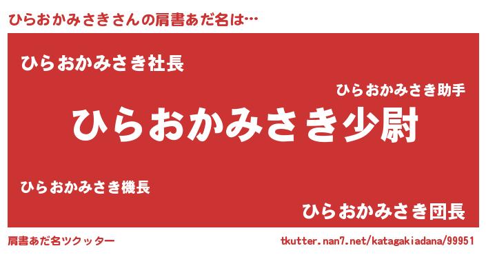 | 女子向けラノベタイトル風あだ名 | 『ひらおかみさきの玉の輿計画!』 |