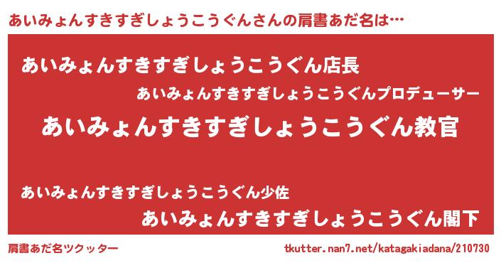 | 欧米人風あだ名 | 『ダレノガレあいみょんすきすぎしょうこうぐん』 |