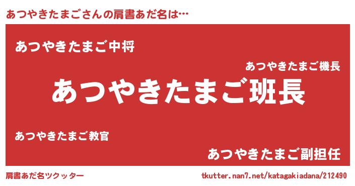 | ヒーロー風カッコイイあだ名 | 『黄金騎士アツ』『ネオアツヤキタマゴ』 |