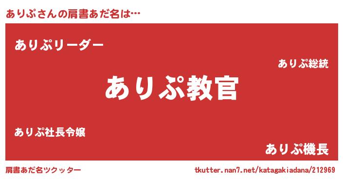 | 意味不明あだ名 | 『住所不定無職ありぷ(84歳)』『自称ありぷ』 |