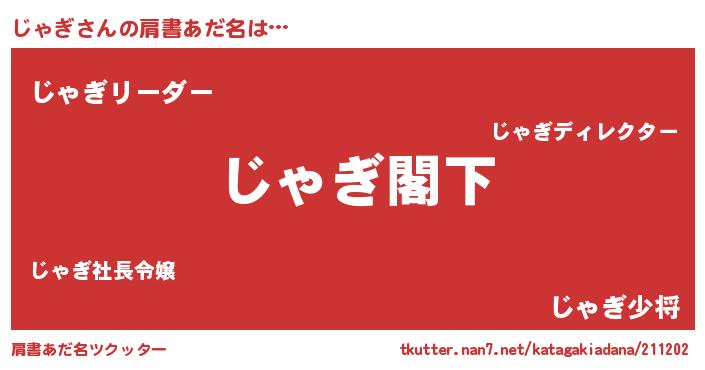 | 男性向けラノベタイトル風あだ名 | 『Re:じゃぎから始める異世界生活』 |