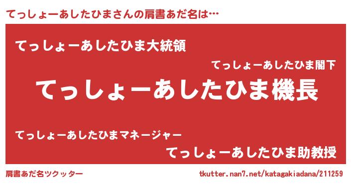 | 男性向けラノベタイトル風あだ名 | 『うちのてっしょーあしたひまが世界を掌握している!』 |