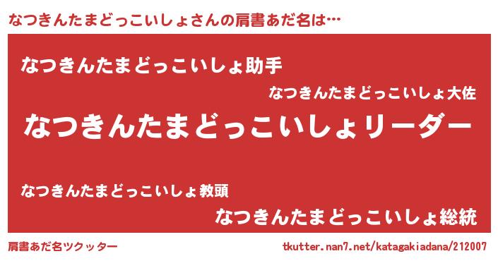 | 男性向けラノベタイトル風あだ名 | 『なつきんたまどっこいしょの嫁は女の子じゃないと思った?』 |