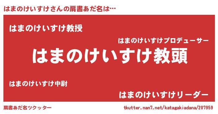 | 男性向けラノベタイトル風あだ名 | 『はまのけいすけという概念が存在しない退屈な世界 』 |