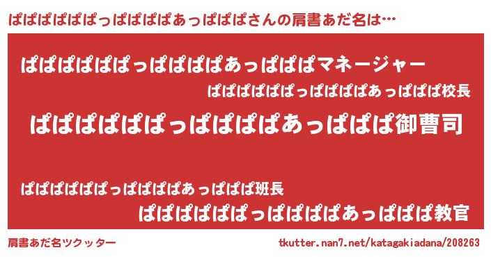 | 男性向けラノベタイトル風あだ名 | 『ぱぱぱぱぱぱっぱぱぱぱあっぱぱぱの憂鬱』 |