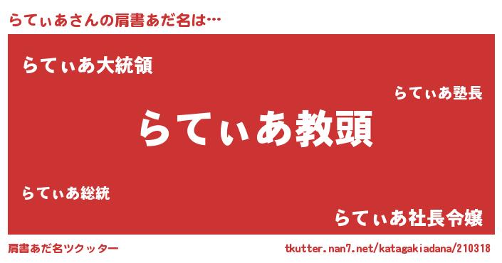 | ヒーロー風カッコイイあだ名 | 『ネオラティア』『ウルトラらてぃあマン』 |