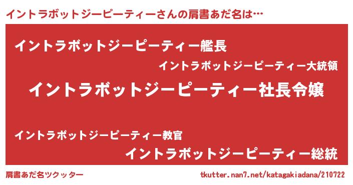 | ヒーロー風カッコイイあだ名 | 『スーパーイントラボットジーピーティー』 |