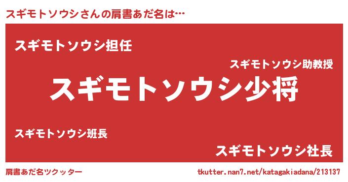 | 男性向けラノベタイトル風あだ名 | 『転生したらスギモトソウシだった件』 |