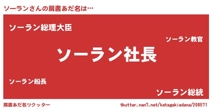 | 男性向けラノベタイトル風あだ名 | 『ソーランの憂鬱』『魔弾の王とソーラン』 |