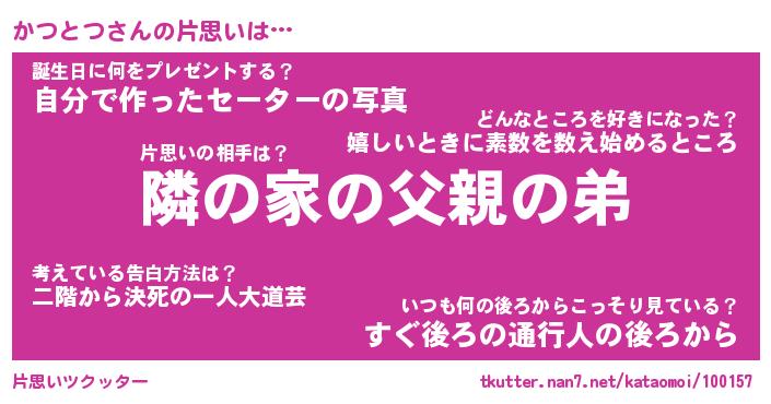 | 男性向けラノベタイトル風あだ名 | 『かつとつの憂鬱』 |