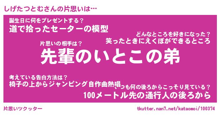 | 男性向けラノベタイトル風あだ名 | 『しげたつとむの憂鬱』 |