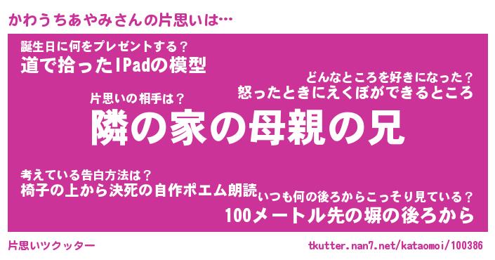 | 女子向けラノベタイトル風あだ名 | 『(仮)かわうちあやみのやんごとなき事情』 |