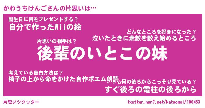 | 女子向けラノベタイトル風あだ名 | 『誰かこのかわうちけんごを説明してください! ~契約から始まるウェディング~』 |