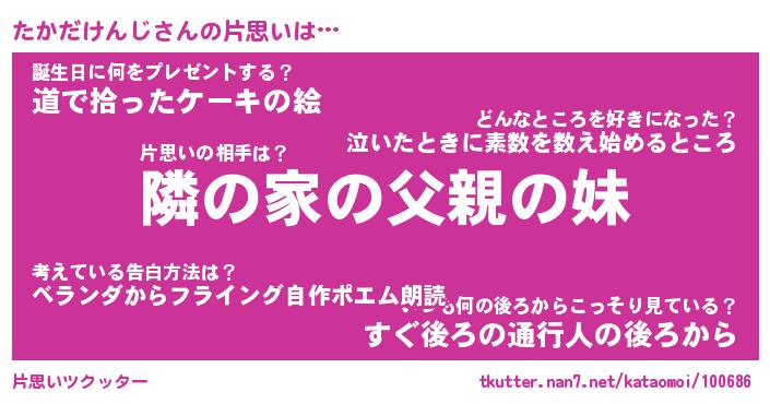 | 男性向けラノベタイトル風あだ名 | 『たかだけんじの憂鬱』 |