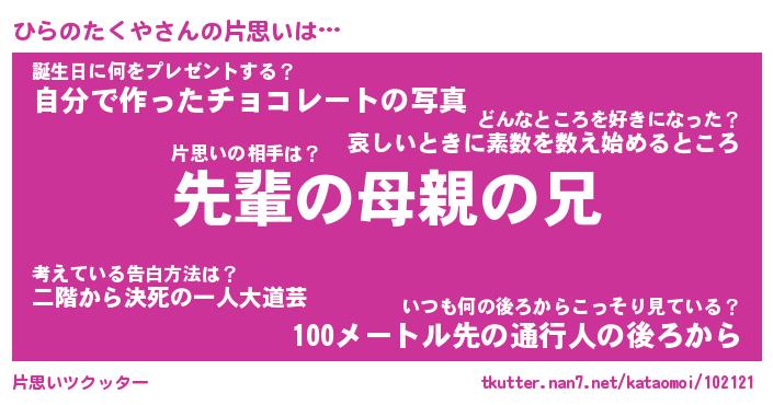 | ツイッター | ひらのたくやさんのツイッターID『katatsumuri_man』 |