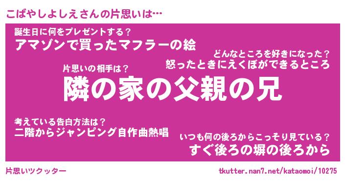 | ヘコむあだ名 | 『こばふぇ~』『なまこ酢』『こばお』 |