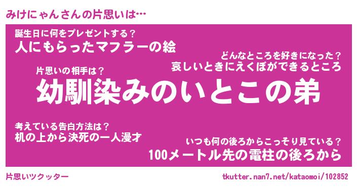 | 男性向けラノベタイトル風あだ名 | 『みけにゃんの憂鬱』 |