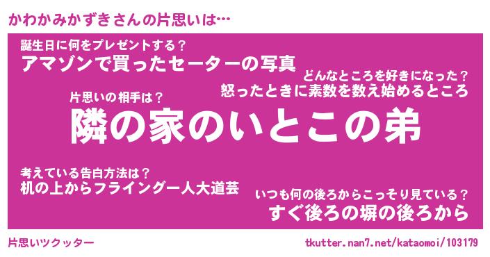 | 女子向けラノベタイトル風あだ名 | 『(仮)かわかみかずきのやんごとなき事情』 |