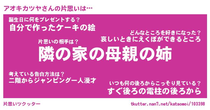 | 肩書あだ名 | 『アオキカツヤ社長』『アオキカツヤ班長』 |