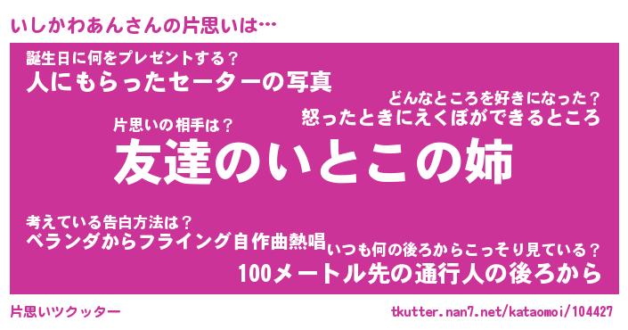 | 女子向けラノベタイトル風あだ名 | 『誰かこのいしかわあんを説明してください! ~契約から始まるウェディング~』 |